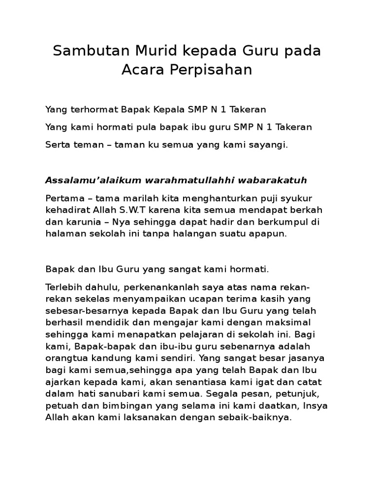45+ contoh pidato perpisahan kepala sekolah. Contoh pidato perpisahan pun biasanya disampaikan oleh wali murid kepala sekolah dan perwakilan siswa. Di postingan ini kami akan berbagi contoh sambutan kepala sekolah untuk perpisahan anak PAUD TK yang bisa dijadikan sebagai referensi untuk menyampaikan sepatah dua patah kata dalam kegiatan perpisahan yang dimaksud. 31 Full PDFs related to this paper.
