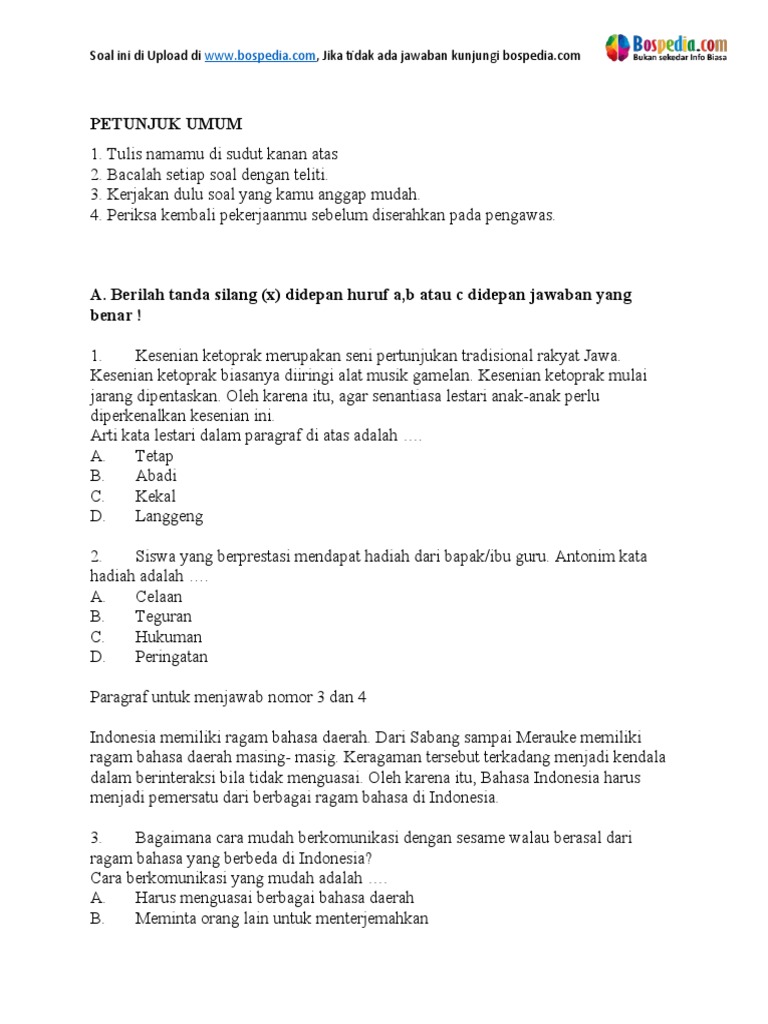 Lengkap 45 Contoh Soal Latihan Un Bahasa Indonesia Sd Kunci Jawaban Paket A Bospedia