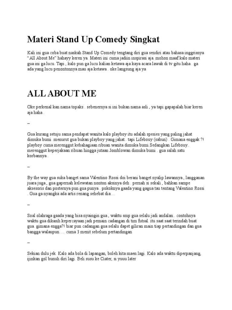 Materi Stand Up Comedy. Seorang stand up comedian harus menulis materi karena stand up comedy bukanlah menceritakan cerita lucu tapi. Disini Kami Membagikan Materi - Materi Untuk Para Komika Yg Membutuhkan Materi Jadi Tolong Bantu Share Dan Hargai Usaha Admin.