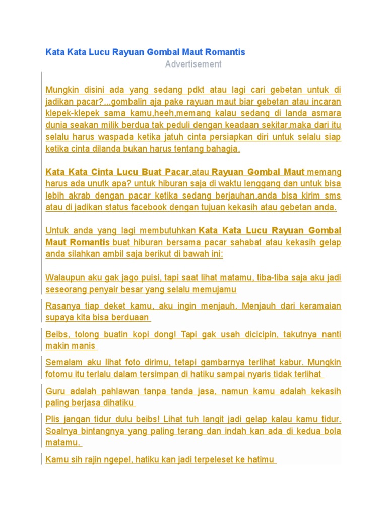 Ketawa Berasama Cerita lucu situs humor Indonesia berisi gambar Orang Lucu Dan Kocak sms lucu teka-teki lucu jokes ngakak dan ketawa-ketiwi gurauan jenaka guyonan dagelan diupdate setiap hari hiburan dewasa bikin tertawa. Kata Kata Gombal Pacar Lagi Marah. Dari kata-kata romantis sampai yang menyentuh hati.